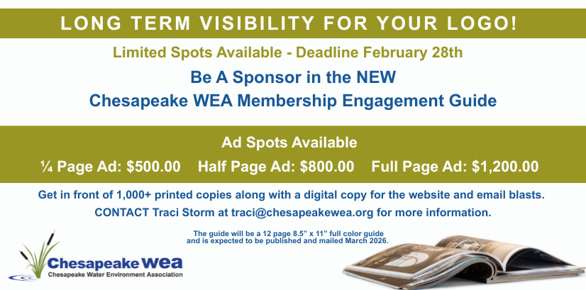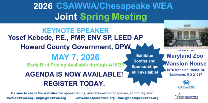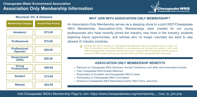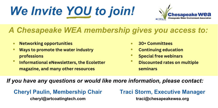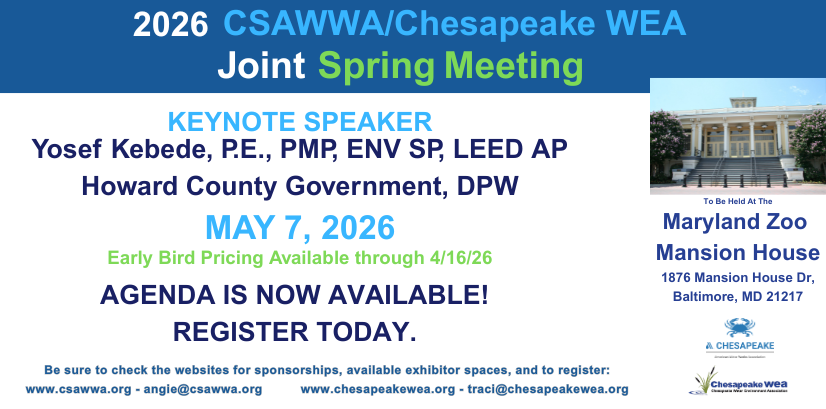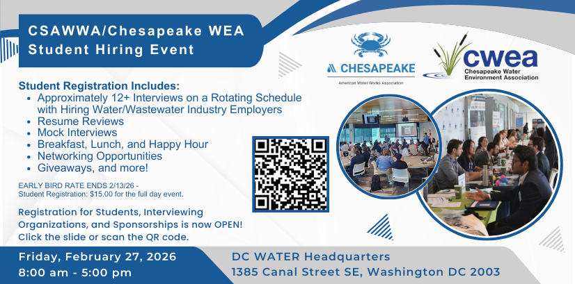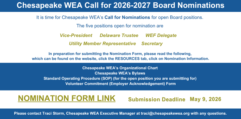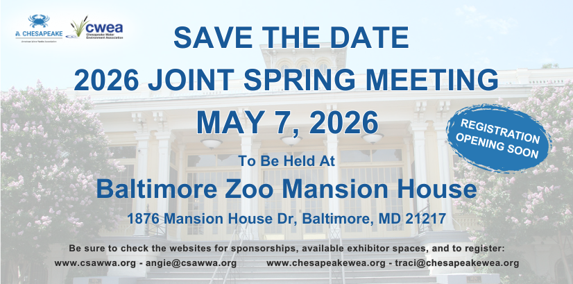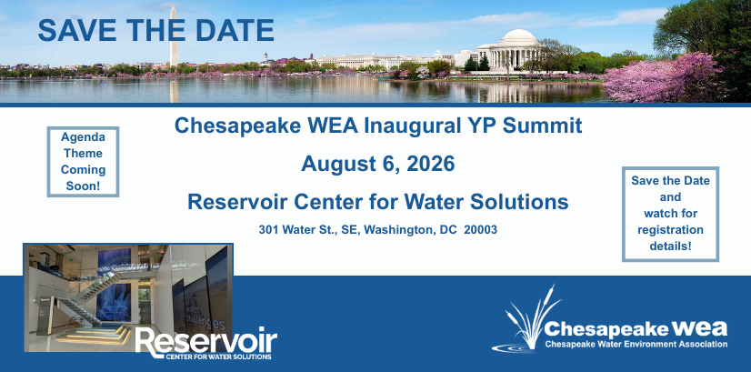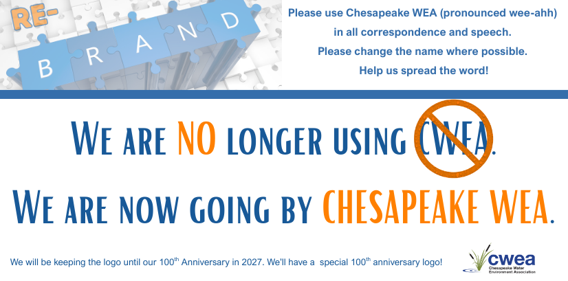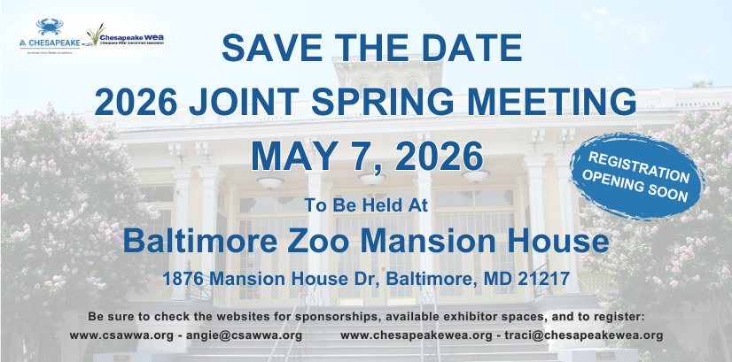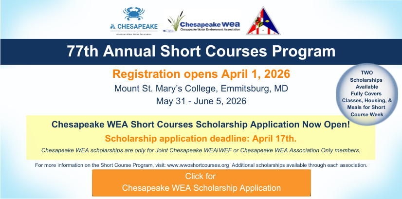 The Chesapeake Water Environment Association is dedicated to improving water quality and protecting the water environment in Delaware, Maryland, and the District of Columbia. The Association strives to do this through public education, the exchange of technical and scientific information among water quality professionals, the training of wastewater and water treatment plant operators, and by offering technical expertise and advice to the law-making and regulatory processes.