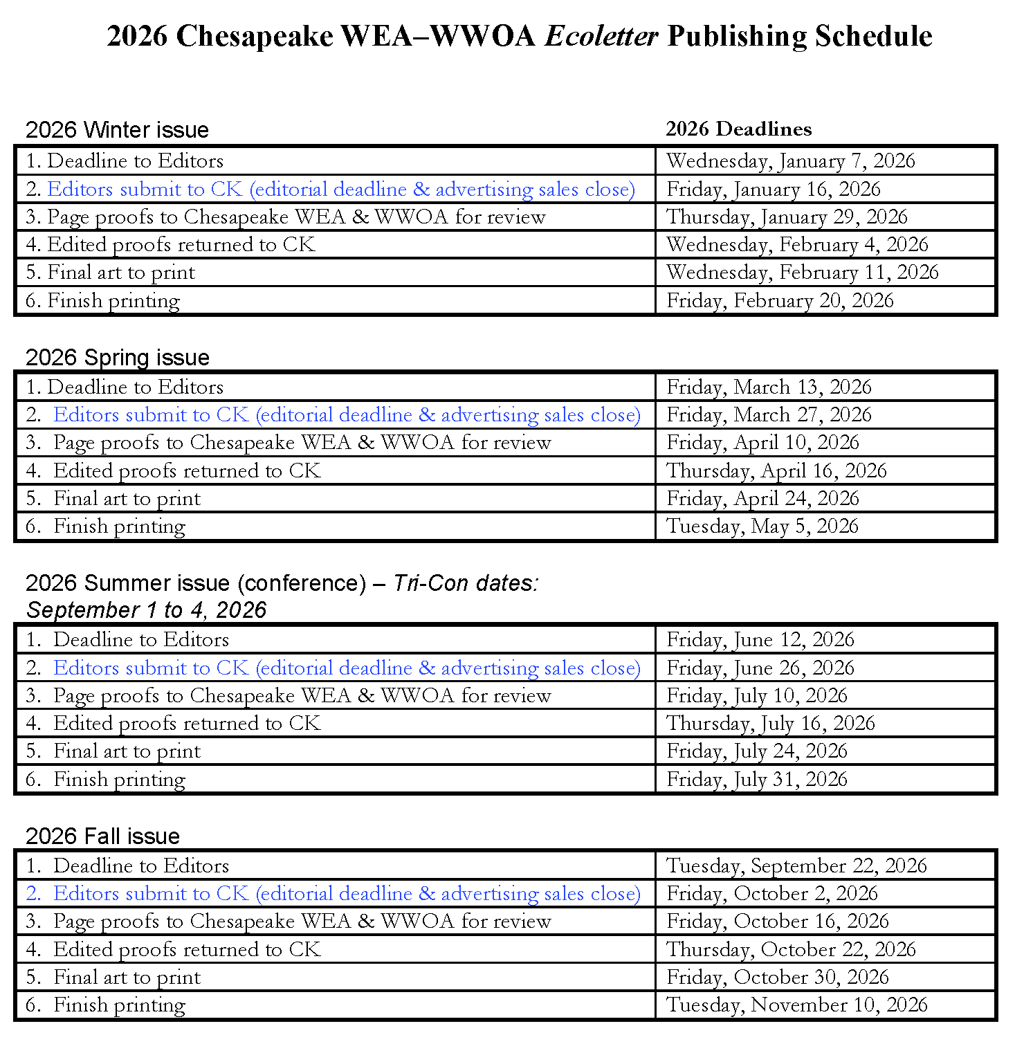 The Ecoletter is the official technical publication of the Chesapeake Water Environment Association published jointly with the Water and Waste Operators Association of Maryland, Delaware, and District of Columbia (WWOA). Each member of the Association receives a copy of this publication four times a year as part of their membership dues. Over 1,600 magazines are mailed each quarter to members of Chesapeake WEA and WWOA.